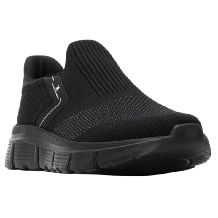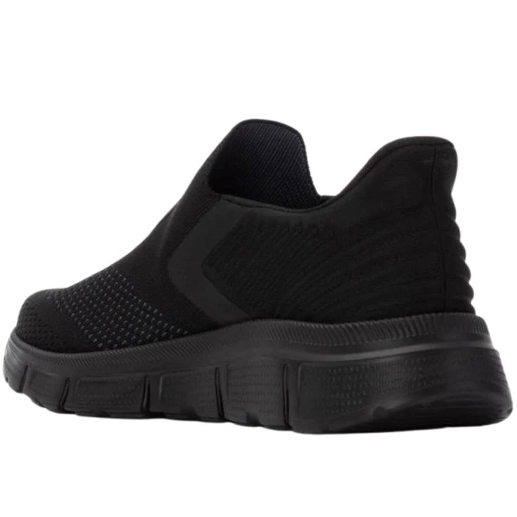 Al calzarlas, sientes cómo el tejido elástico abraza el pie con suavidad y flexibilidad, eliminando la resistencia de cordones. La suela negra de goma transmite una sensación de firmeza ligera y soporte continuo, mientras el acabado negro añade una atmósfera discreta y actual.