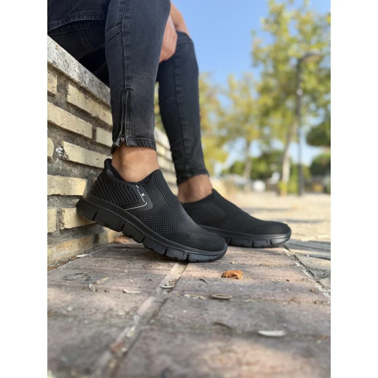 Este modelo de zapatilla de hombre confeccionado en tejido elástico tipo calcetín en color negro es una opción ligera y versátil, ideal para el uso diario con un estilo casual-moderno.