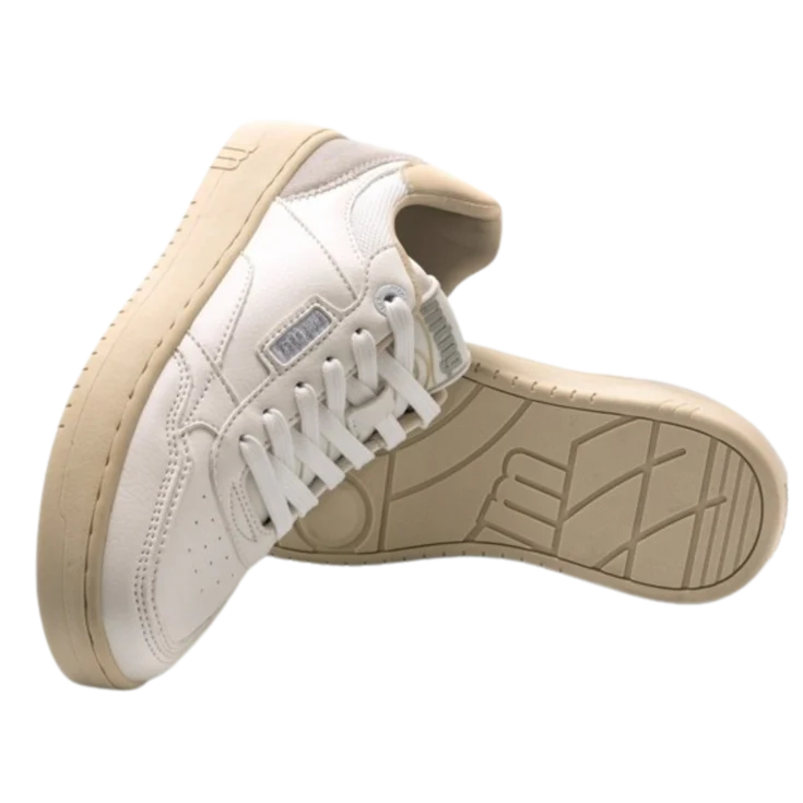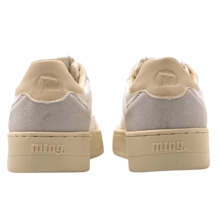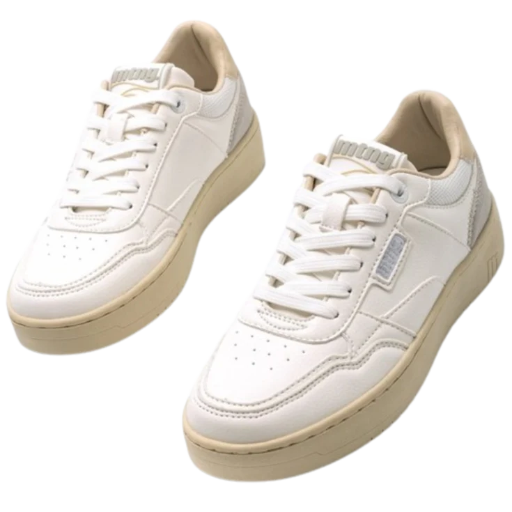 Zapatilla Delta Mustang para mujer, diseñadas en color blanco con paneles de color gris en el contrafuerte. Suela color arena al tono con el borde superior de la zapatilla y su interior. Su puntera ligeramente alzada proporcionará comodidad a tu pisada.