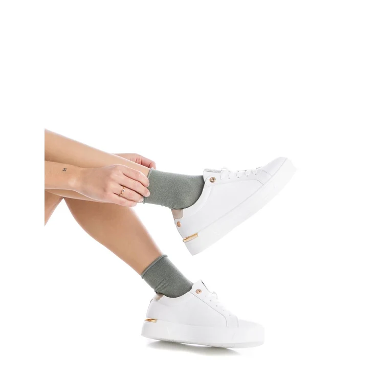 Zapatilla deportiva XTI, modelo en color blanco, parte traseras combinado en color oro, cierre de cordones planos, plataforma de 2 cm, puntera redonda y levantada para garantizar la comodidad.