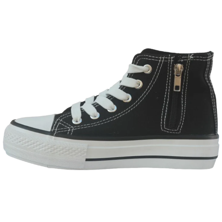 Zapatilla deportiva Zulen, modelo de lona en color negro con pespuntes en blanco, cierre de cordones planos y de cremallera lateral, puntera redonda y levantada para garantizar la comodidad, plataforma de 3 cm.