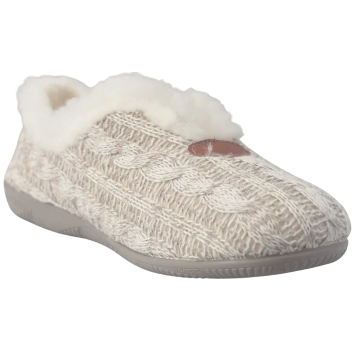 Sumérgete en un ambiente de calidez y confort con esta zapatilla cerrada pensada para esos momentos de descanso en casa. El tejido de punto trenzado en tono beig aporta un toque refinado y acogedor, mientras su construcción prioriza la comodidad y la seguridad al caminar.