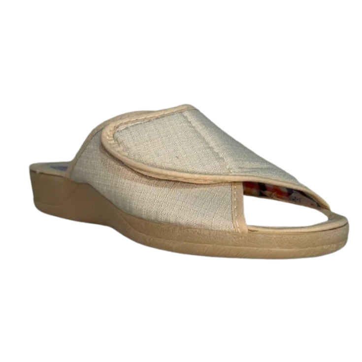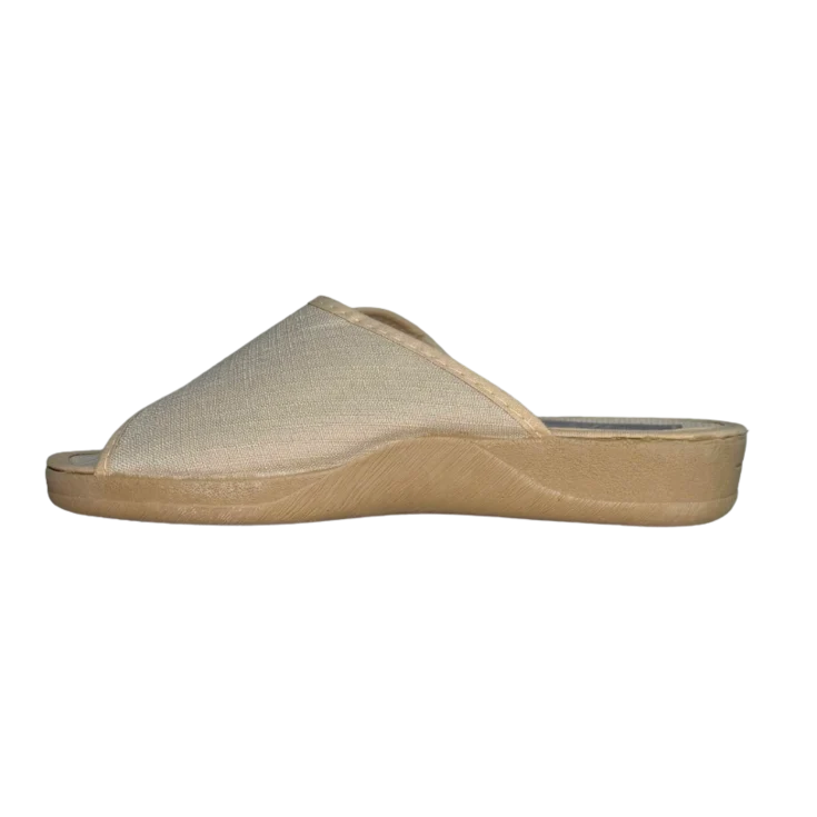 Una zapatilla de descanso diseñada para brindarte comodidad y ligereza en el ámbito doméstico. Su tono beige neutro se adapta con suavidad al entorno del hogar.