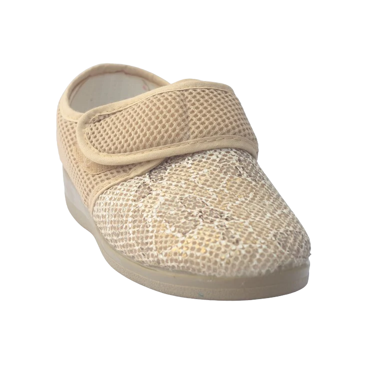 Al ponerlas, tu pie se desliza dentro de un tejido suave que combina diferentes tonos de beig, generando una sensación envolvente de comodidad. El cierre de velcro permite adaptarse al contorno del pie sin esfuerzo. Al dar los primeros pasos, la base firme y antideslizante se siente segura, mientras la ligera elevación otorga un apoyo equilibrado y estable.