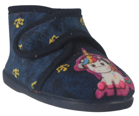 Unas zapatillas de casa diseñadas especialmente para los más pequeños, en un vistoso color marino con divertido estampado de unicornio, ideales para disfrutar de la comodidad y el descanso en el hogar.