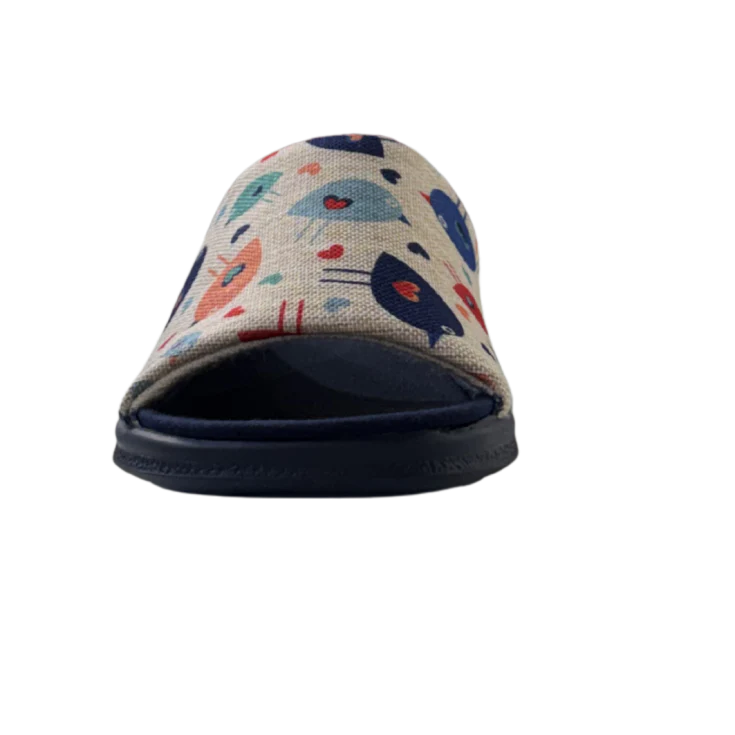 Diseñadas para ofrecer máximo confort en el hogar, estas zapatillas destacan por su pala ancha con estampado de pájaros y pequeños corazones, que aportan un aire alegre y moderno. Su plantilla suave y su suela ligera garantizan una pisada cómoda, ideal para relajarte en casa con estilo.