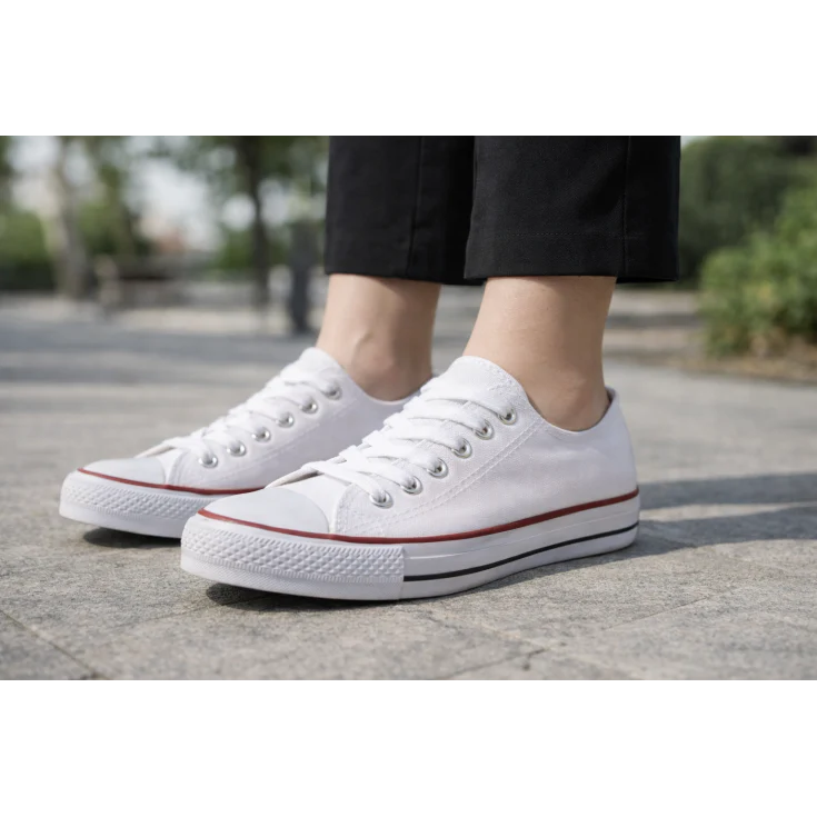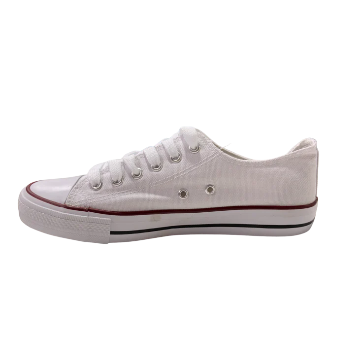 Estas zapatillas de lona blanca destacan por su estética minimalista y su silueta baja, perfecta para looks urbanos, informales o incluso combinaciones más pulidas. Incorporan puntera de goma reforzada y suela blanca con línea decorativa lateral que añade un sutil contraste. Ligeras y cómodas, están pensadas para acompañarte en el día a día con estilo y practicidad.