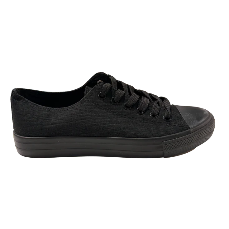 Estas zapatillas de lona en color negro combinan un diseño clásico con cordones y puntera reforzada, creando un modelo resistente y fácil de combinar. Su estética “total black” las convierte en el aliado perfecto para looks casuales, streetwear o incluso outfits más arriesgados. Ligeras y prácticas, están pensadas para acompañarte todo el día.