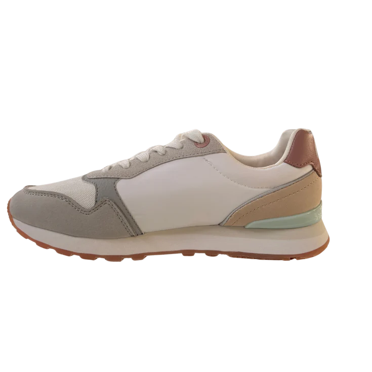 Estas zapatillas deportivas presentan una silueta clásica de inspiración retro reinterpretada con una paleta de tonos suaves. La combinación de blanco, beige, gris y rosa crea un diseño equilibrado y moderno, ideal para acompañar looks informales con un aire desenfadado. Un modelo versátil que encaja tanto en rutinas diarias como en planes más relajados.