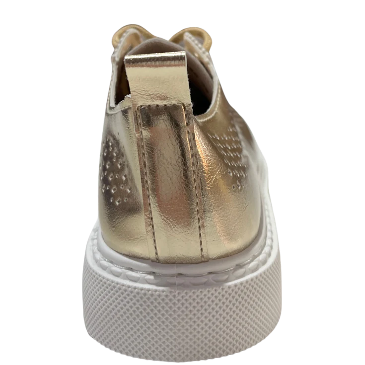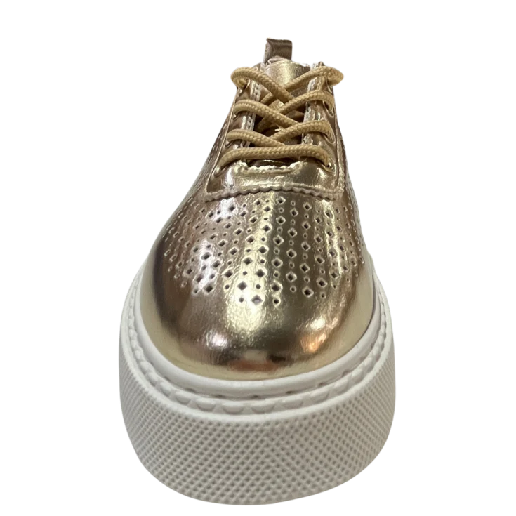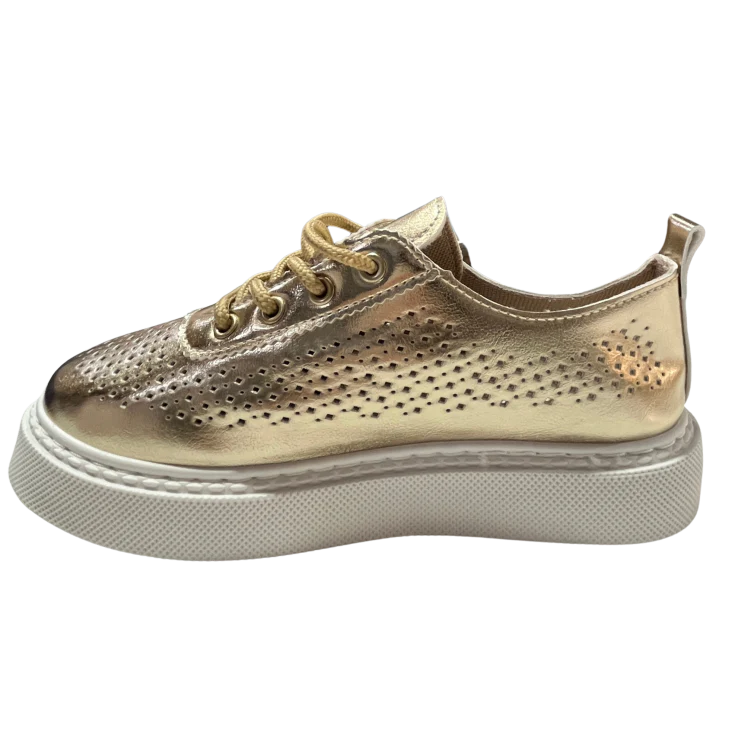 Las Zapatillas Deportivas Plataforma Oro son la combinación perfecta entre tendencia urbana y brillo sofisticado. Su acabado metalizado en tono oro eleva cualquier look casual, mientras su diseño perforado y su suela con plataforma aportan comodidad y estilo en cada paso. Ideales para mujeres que buscan destacar con un toque moderno sin renunciar al confort diario.