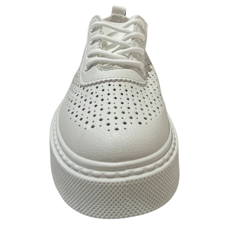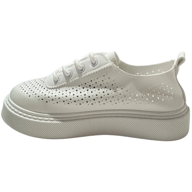 Estas sneakers blancas destacan por su diseño perforado que favorece la transpirabilidad y su estructura ligera pensada para acompañarte durante horas. La plataforma aporta altura equilibrada y un toque moderno, convirtiéndolas en el complemento perfecto para looks casuales, urbanos o sport chic.