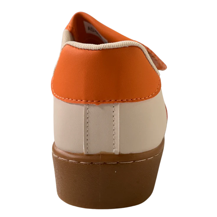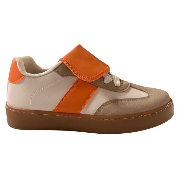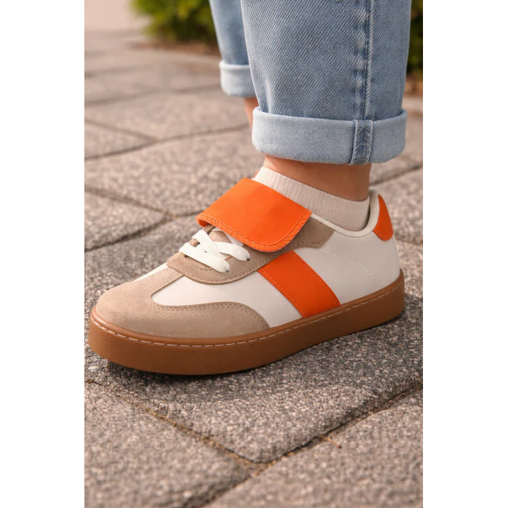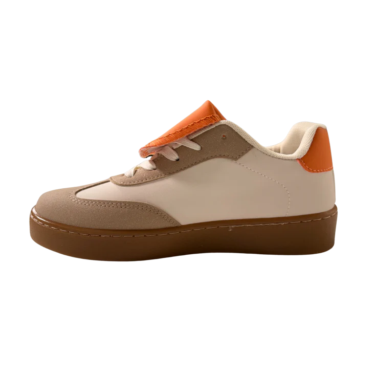 ● Diseño deportivo casual con combinación de tonos neutros y naranja vibrante