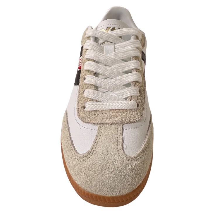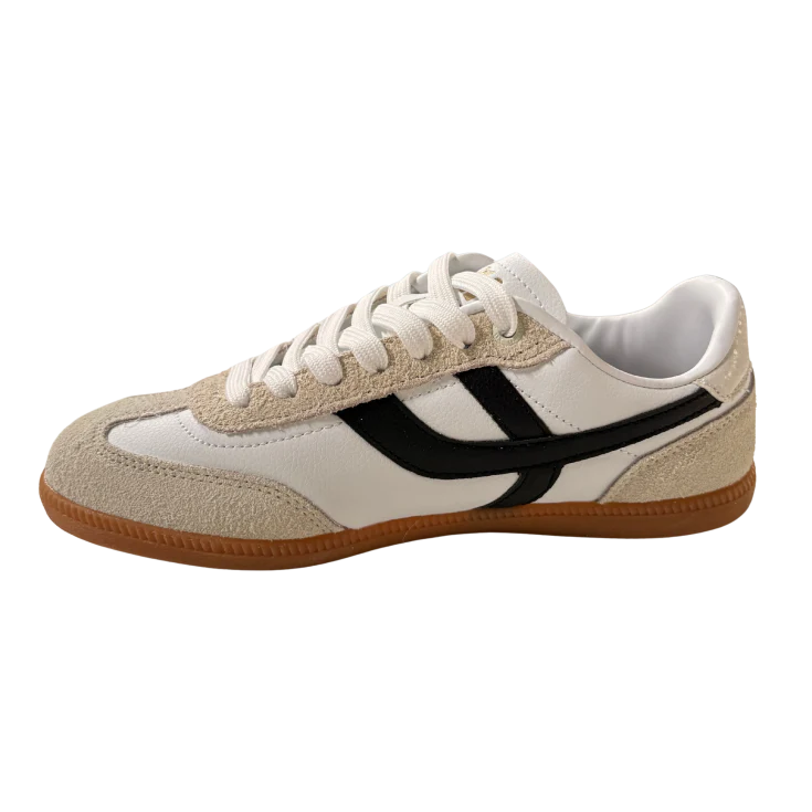 El exterior ofrece una textura suave y agradable, mientras que la suela de goma aporta una pisada firme y estable. Visualmente, el contraste entre el blanco limpio, el negro intenso y la base caramelo transmite un estilo retro moderno muy actual.