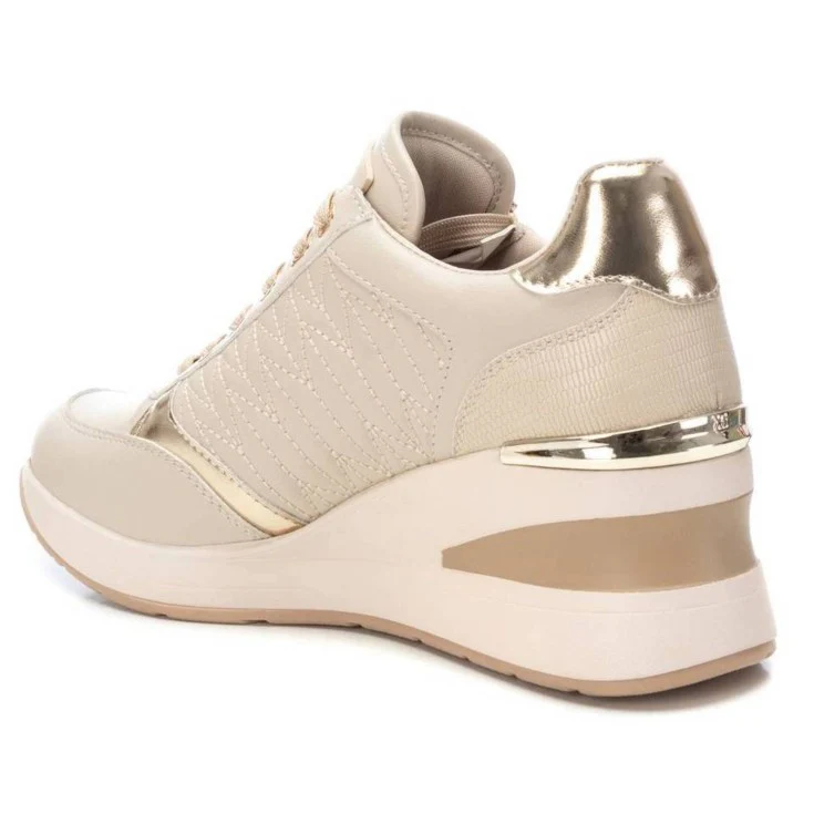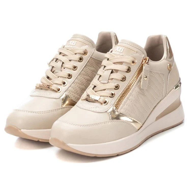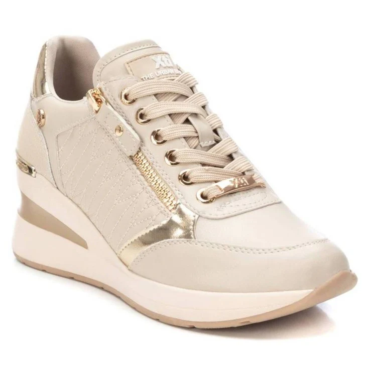 Las zapatillas deportivas XTI con cuña en color beige son la elección perfecta para quienes buscan estilo y comodidad en un solo calzado. Su diseño moderno con detalles dorados y cremallera lateral las convierte en el aliado ideal para looks urbanos y sofisticados.