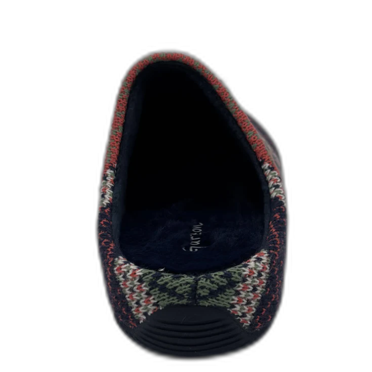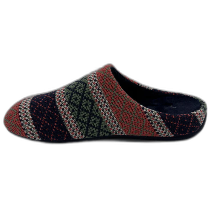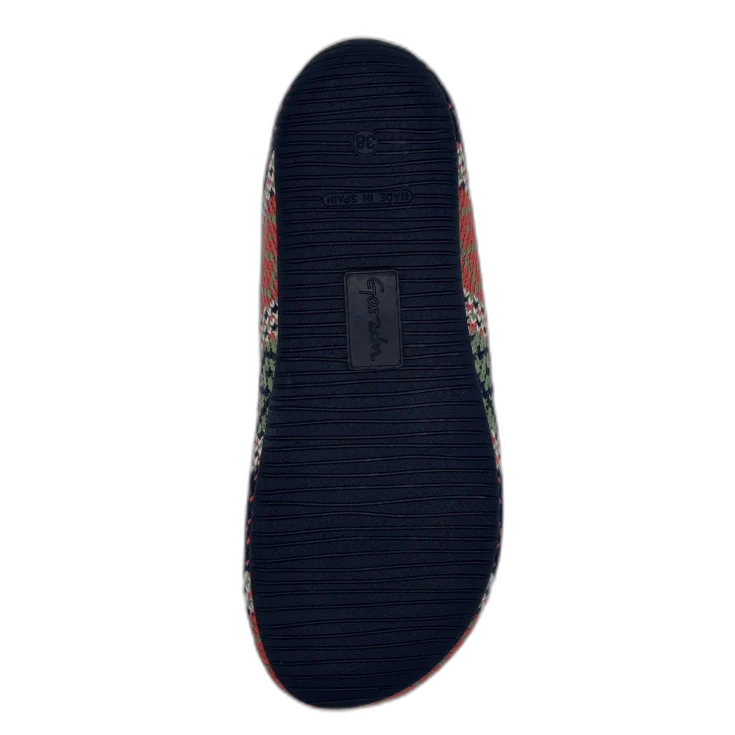 Este zueco invertido destaca por su exterior tejido en tonos marino, verde y burdeos, formando un patrón geométrico cálido y artesanal. Su interior afelpado proporciona una sensación extremadamente suave que abriga y envuelve el pie desde el primer paso. Incorpora un piso de 3,5 cm, que aporta una ligera elevación y mayor comodidad en cada pisada sin perder ligereza.