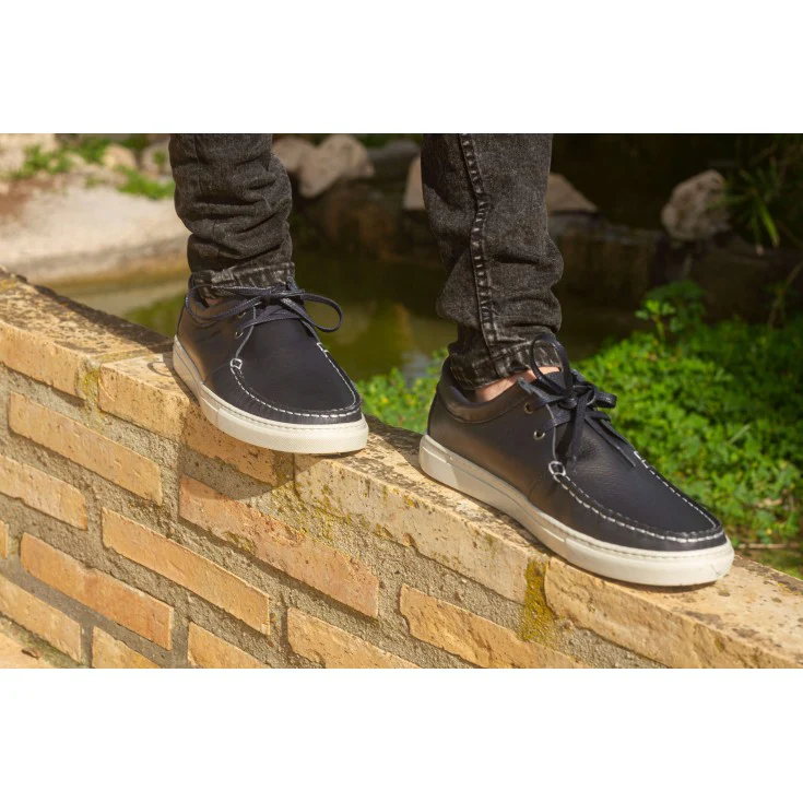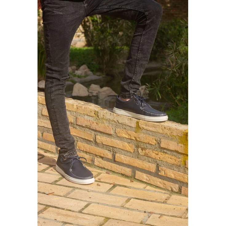 Al calzarlo sentirás la suavidad de la piel que abraza el pie, mientras el tono marino transmite sobriedad y versatilidad. La suela de goma amortigua cada pisada, y el interior acolchado otorga una sensación de confort prolongado desde el primer momento.