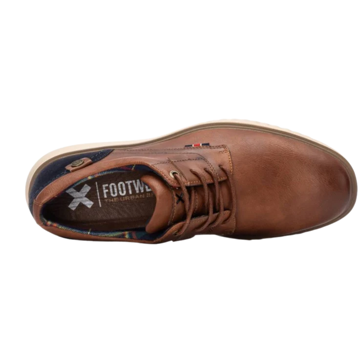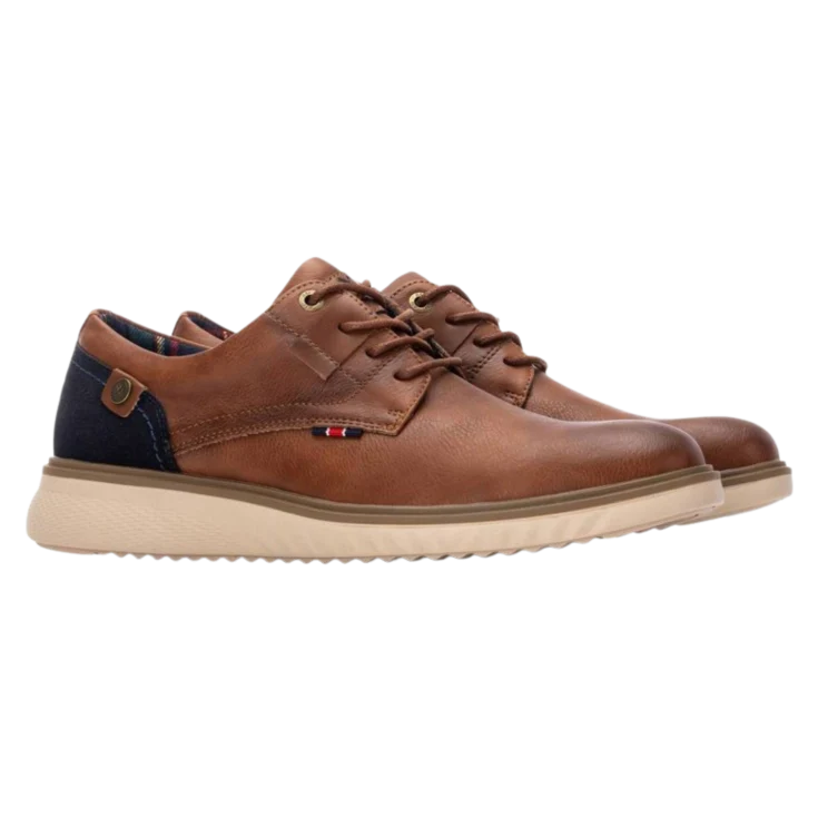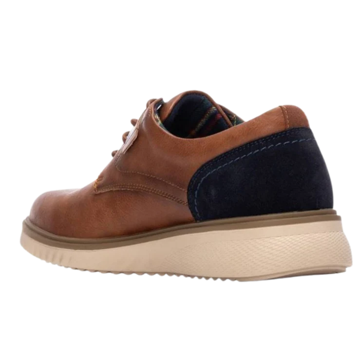 Al calzarlo percibirás la suavidad del acabado tipo piel al tacto, mientras el tono camel irradia calidez y sofisticación. El interior acolchado envuelve el pie con una sensación de confort envolvente, y la suela amortigua cada impacto, generando una pisada firme pero suave.