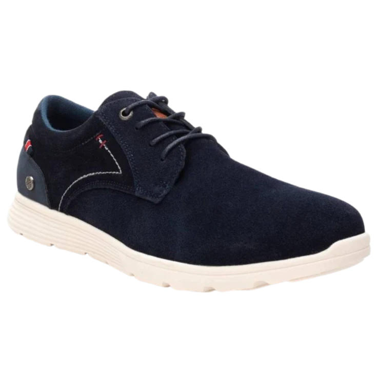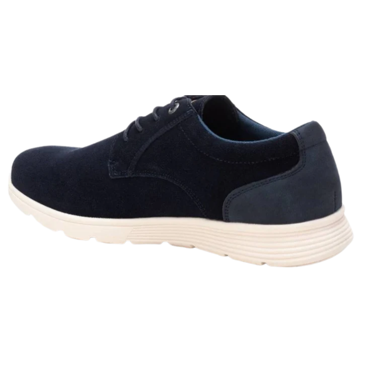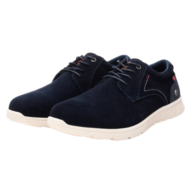 Al calzar este modelo notarás la suavidad del serraje acariciando el empeine, mientras el tono azul marino transmite profundidad y sobriedad. La suela responde con firmeza bajo cada paso, y el interior textil envuelve el pie con una sensación de confort discreto que invita a caminar con seguridad.