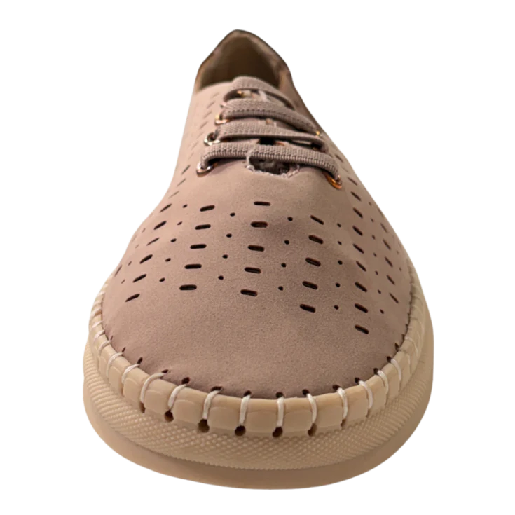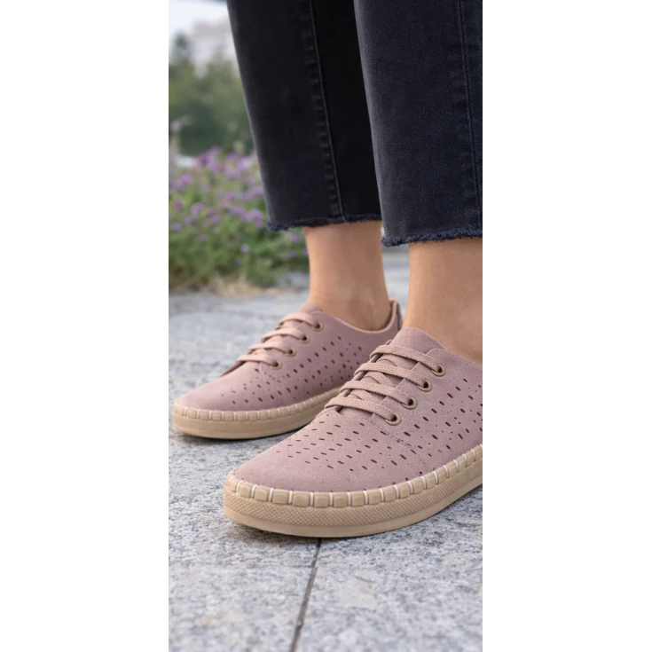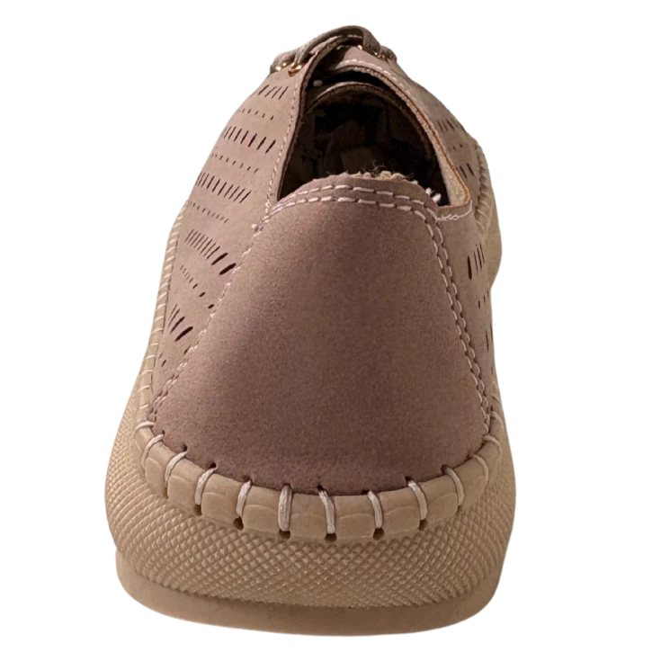 Al calzarlo, sentirás una pisada blanda y estable que reduce la presión en cada paso. La plataforma de 2,5 cm ayuda a amortiguar la pisada y favorece una postura más cómoda durante el día. La textura aterciopelada y el tono rosa suave transmiten una sensación de confort visual y táctil, ideal para el uso diario.