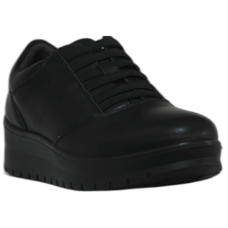 Un zapato de líneas limpias y acabado en negro, elegante y funcional. Su suela ancha y ligera proporciona estabilidad, mientras que el empeine con elásticos permite un ajuste cómodo, práctico y sin esfuerzo.