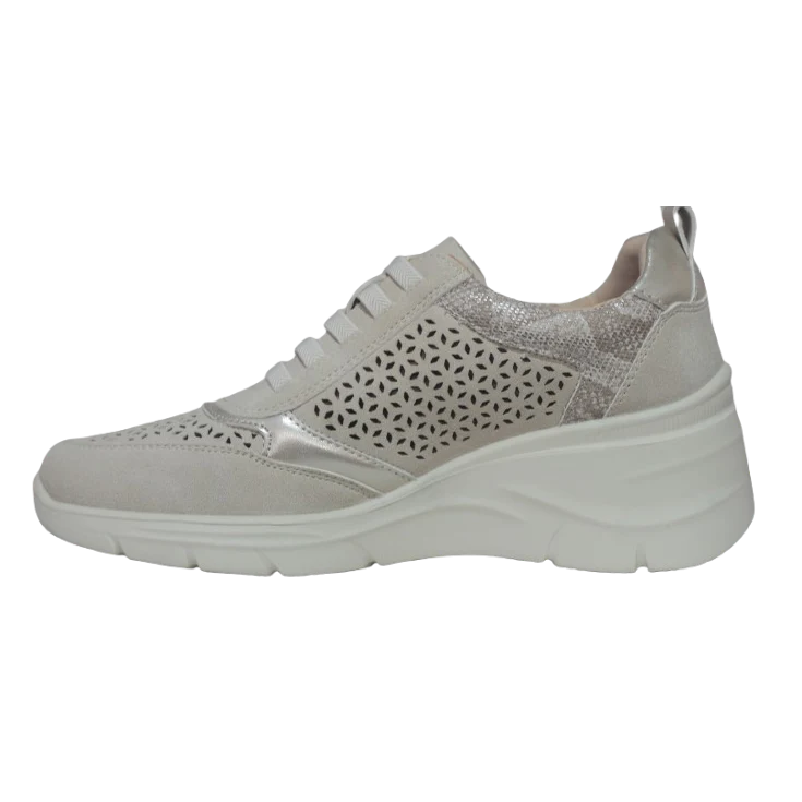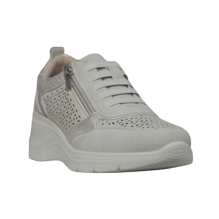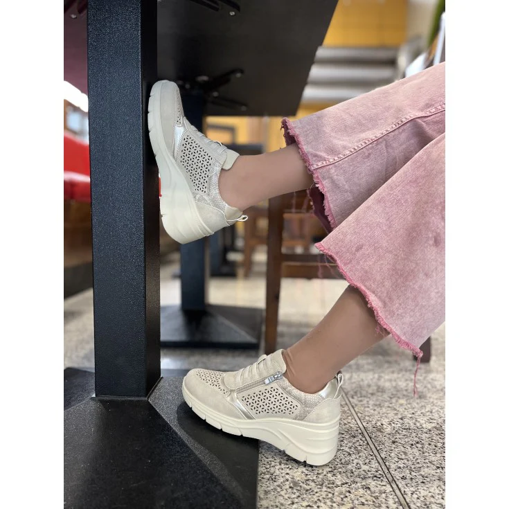 Con una plataforma de 2 cm y una cuña de 6,5 cm, este zapato ofrece una pisada estable y ligera. Además, su combinación de cordones elásticos y cierre de cremallera lateral permite un ajuste rápido y sin esfuerzo, ideal para el día a día.