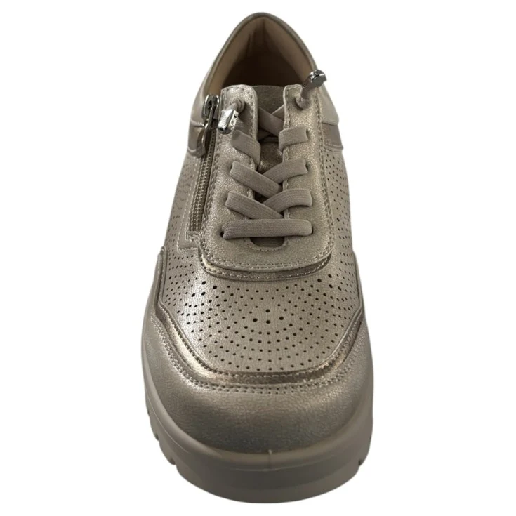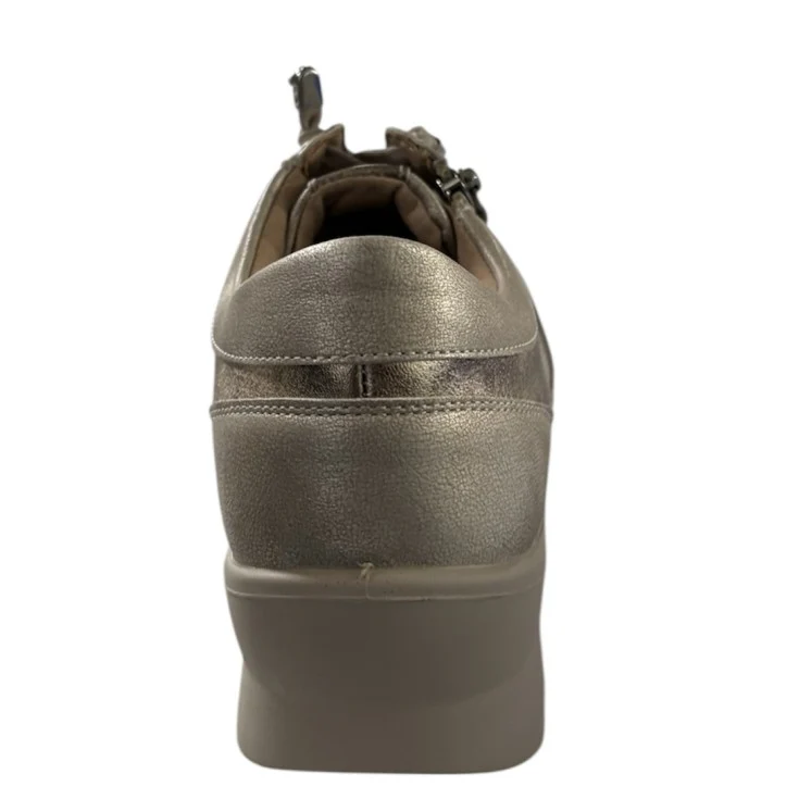 El Zapato Cómodo Plenara Platino combina elegancia contemporánea y confort absoluto en un diseño deportivo chic. Su acabado metalizado en tono platino aporta luz y sofisticación, mientras su suela gruesa garantiza estabilidad y comodidad durante todo el día.