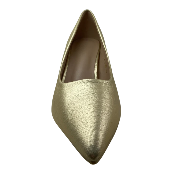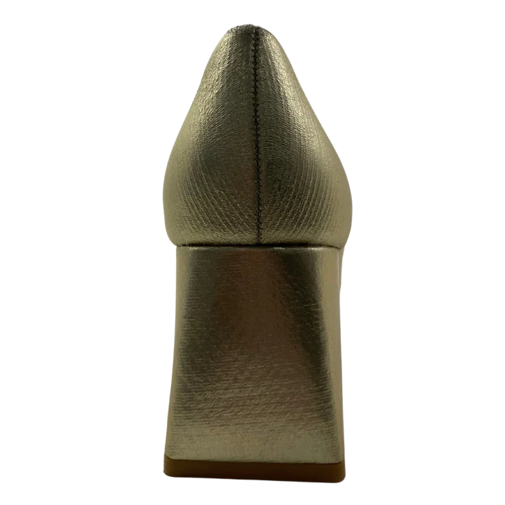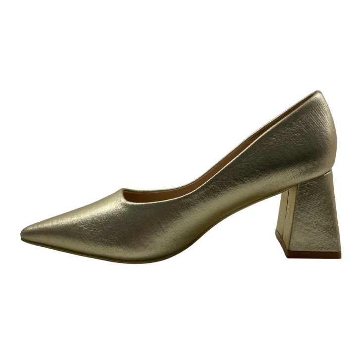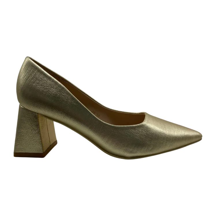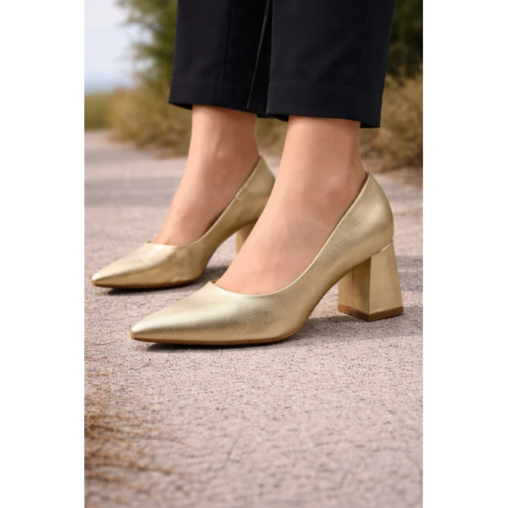 Sofisticación luminosa para momentos que merecen brillar. El Zapato de Salón Mireia Oro combina la elegancia atemporal del diseño clásico con un acabado metalizado dorado que aporta distinción y estilo. Su tacón ancho de 6 cm ofrece la altura perfecta para estilizar con comodidad. Perfecto para invitadas, eventos especiales o para elevar tus looks de oficina con un toque refinado.