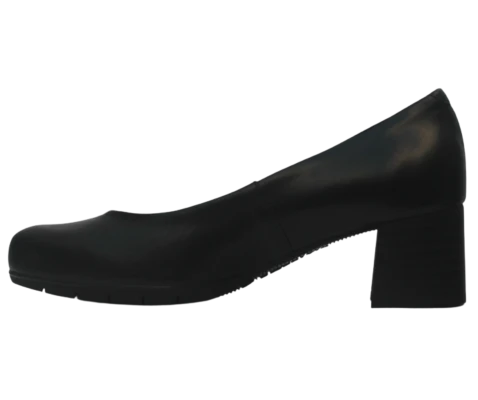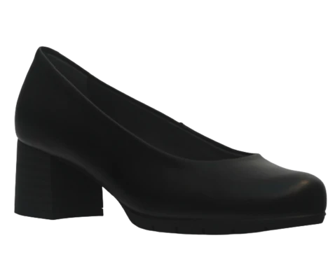 La superficie de piel transmite un tacto suave y natural, mientras el tono negro ofrece un acabado sobrio, elegante y versátil. Caminar con él es sentir firmeza y amortiguación gracias al diseño armonioso del tacón y la plataforma.
