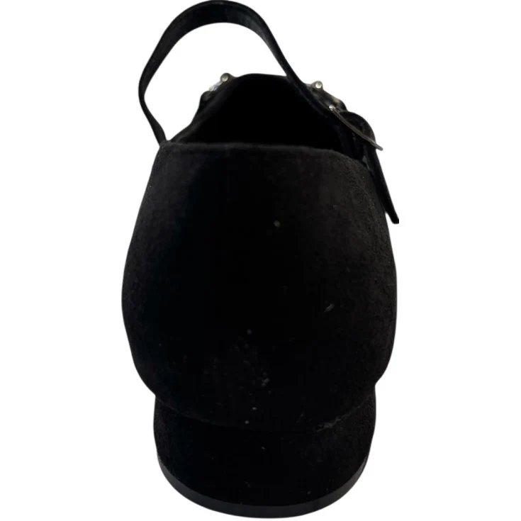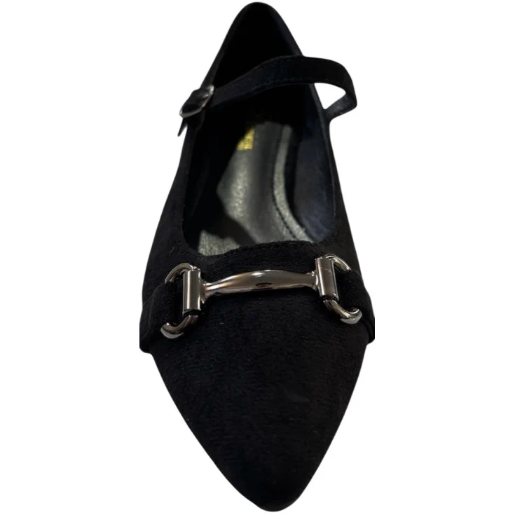El negro profundo realza el brillo sutil del detalle metálico, creando un contraste sofisticado y moderno, mientras el tacón de 2,5 cm aporta una pisada estable y equilibrada.