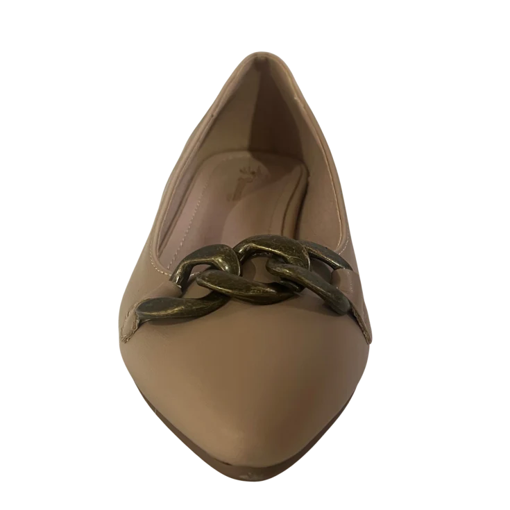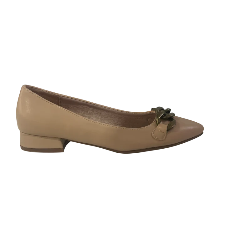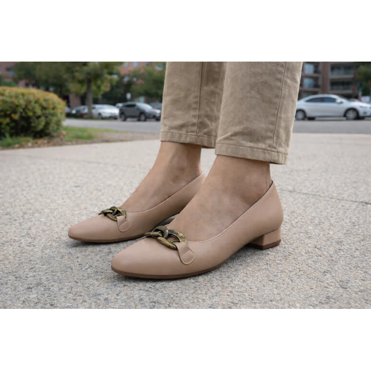 El Zapato de Salón Zoe Beige es el equilibrio perfecto entre elegancia minimalista y comodidad diaria. Su diseño depurado en tono beige neutro, combinado con un sofisticado detalle de cadena, lo convierte en un imprescindible versátil para oficina, eventos o looks casual chic.