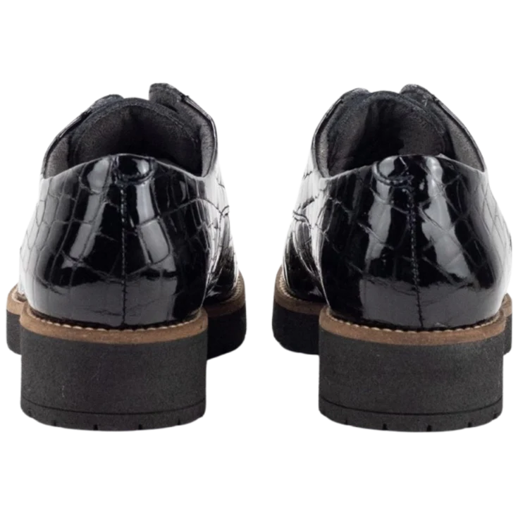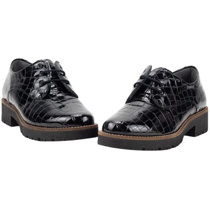Zapato de vestir Julieta, modelo de la marca pitillos, modelo de piel en color negro charol, pespuntes en forma de cuadrado, cierre de cordones redondo, puntera redonda y levantada para garantizar la comodidad al caminar, piso de goma antideslizante de 2 cm y plataforma de 1,5 cm.